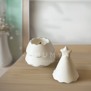 Yılbaşı temalı, çam ağacı şeklindeki kapaklı mum, ahşap fitilli beyaz mumu ile sade ve şık bir hediye seçeneği sunuyor. Yılbaşı dekorunuza zarif bir dokunuş katarken, sevdiklerinize huzur dolu bir atmosfer hediye edin.